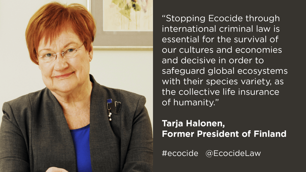 Painavassa lausunnossaan Tarja Halonen sanoo: ”Luonnontuhonnan lopettaminen kansainvälisen rikosoikeuden kautta on olennaista meidän kulttuuriemme ja talouksiemme säilymiselle, sekä ratkaisevaa ekosysteemien ja niiden lajistollisen monimuotoisuuden turvaamiseksi ihmiskunnan yhteisenä henkivakuutuksena.”
