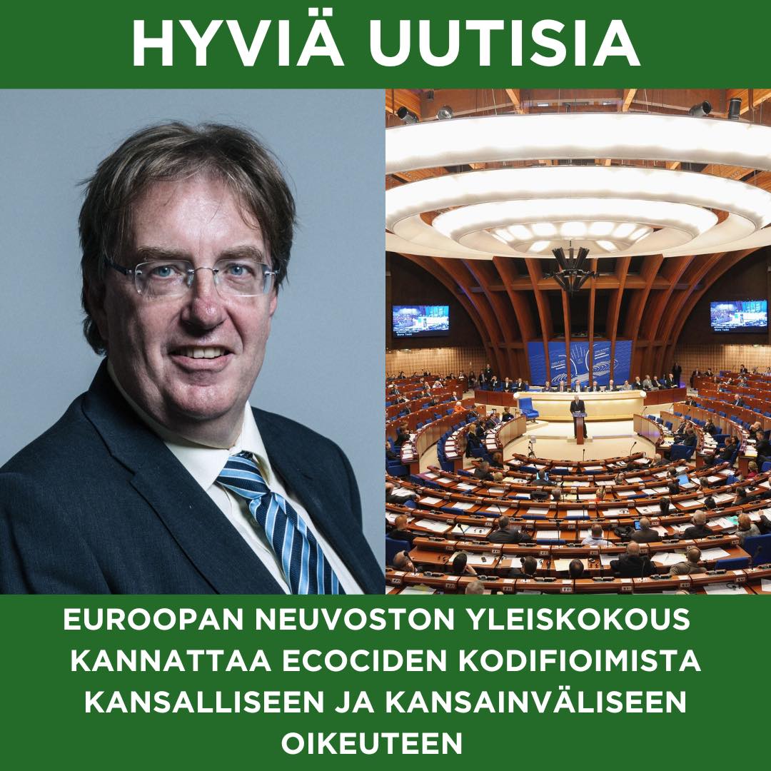 Euroopan neuvoston parlamentaarinen yleiskokous on viime viikolla äänestänyt yksimielisesti Luonnontuhonnan (Ecocide) tunnustamista vaativan päätöslauselman hyväksymisestä.