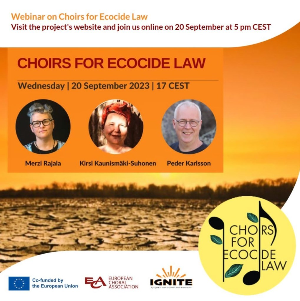 Merzi Rajala, Kirsi Kaunismäki-Suhonen ja Peder Karlsson ovat luoneet ”Choirs for Ecocide Law” -hankkeen kaikille kuoroille, jotka haluavat lisätä tietoisuutta Luonnontuhonta- lain tarpeesta kuratoidun konserttikokonaisuuden kautta!