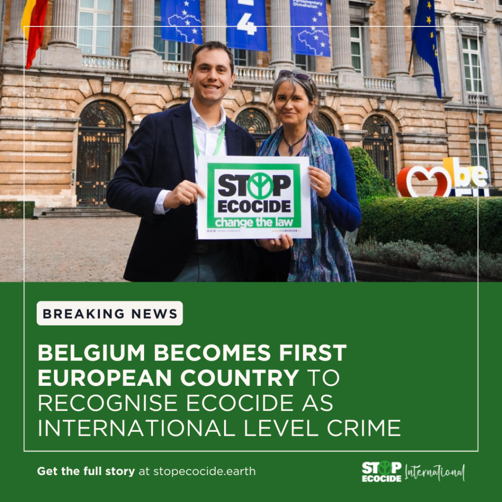 Lisäksi Belgiasta on tullut ensimmäinen Euroopan maa, joka tunnustaa luonnontuhonnan kansainväliseksi rikokseksi rikoslaissaan, Stop Ecocide Foundationin koolle kutsuman riippumattoman asiantuntijapaneelin (IEP) vuonna 2021 esittämän konsensusmääritelmän perusteella.
